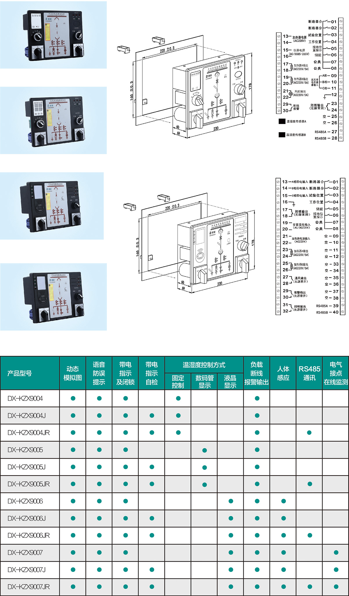 DX-KZX9000系列開關柜智能操控裝置,產品功能強大,具有動態一次模擬圖、高壓帶電顯示、自動加熱除濕數值顯示及控制、斷路器分合狀態指示、儲能指示、接地開關狀態指示、小車位置指示、分合閘回路完好指示、人體感應帶電提示及柜內照明、觸頭/電纜搭接頭無線測溫功能、語音防誤提示等功能,并且具有尺S485通訊接口,能夠使開關柜進一步智能化,網絡化,數字化,方便廣大用戶使用與操作。
